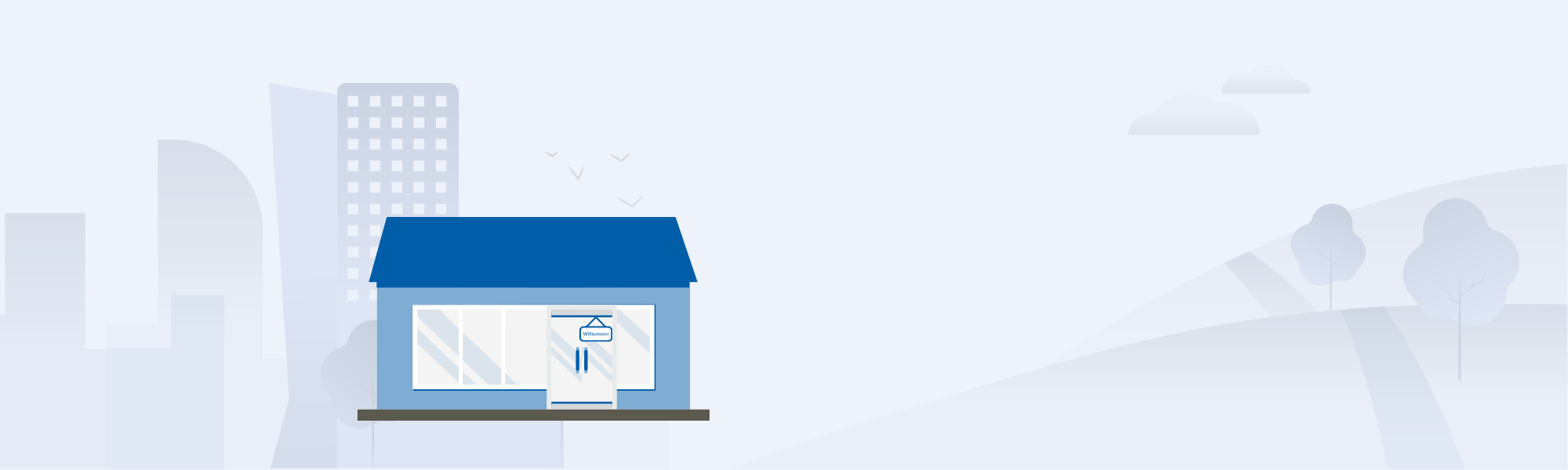 Illustration eines kleinen Geschäftsgebäudes mit blauem Dach, großen Schaufenstern und „Willkommen“-Schild an der Eingangstür​